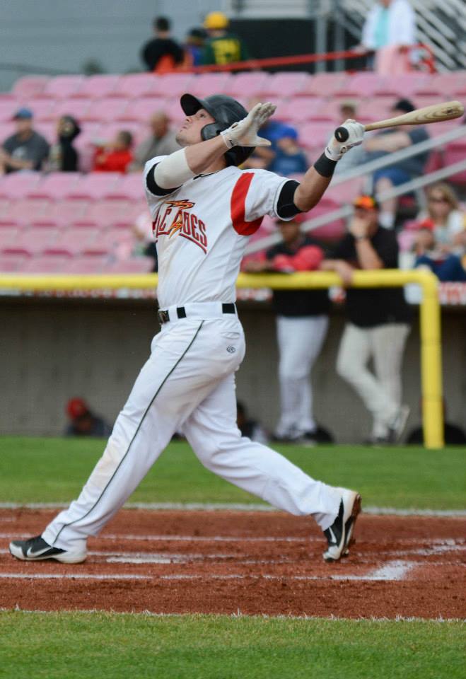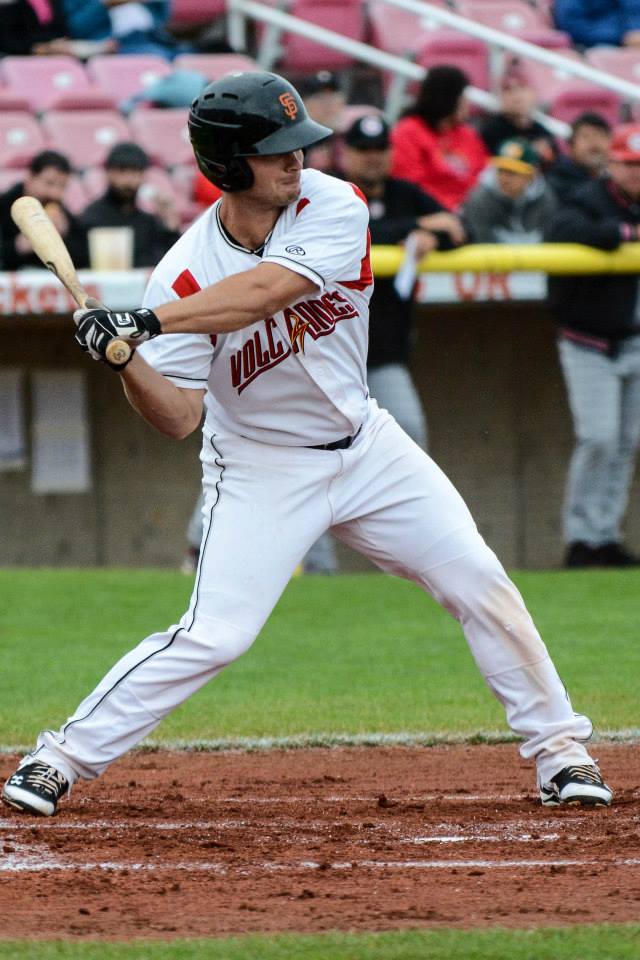 Sam Eberle didn’t quite feel comfortable in his first pro season with the Volcanoes. Eberle, a 25th round choice out of Jacksonville State (Ala.) last year, was a third baseman and, when needed, a catcher in college. The Giants wanted to try Eberle’s hand as a regular catcher in the mix with two other veteran plate protectors in Dashenko Ricardo and Trevor Brown. Imagine trying to master the catching role, adjust to pro baseball, and having to compete with two others for playing time. Eberle did not have the chance to get in a groove, playing in 36 games hitting .248 with four doubles and 12 RBI. The Giants scrapped the catching plan, and allowed Eberle to clear his head of defensive distractions. That decision set the stage for an emerging power hitter to break out this season. Eberle destroyed the baseball at the beginning of the 2013 NWL season, hitting 10 doubles, three triples, and five home runs in the first four weeks. Eberle was voted the Northwest League’s top offensive player in the first week after smashing seven doubles, a triple, his first pro home run on June 16 vs. Hillsboro and 5 RBI. Eberle has benefited from the singular focus on his ability to put backspin, line-drive doubles into the gaps, according to Giants Minor League Hitting Coordinator and former Volcanoes manager Steve Decker.